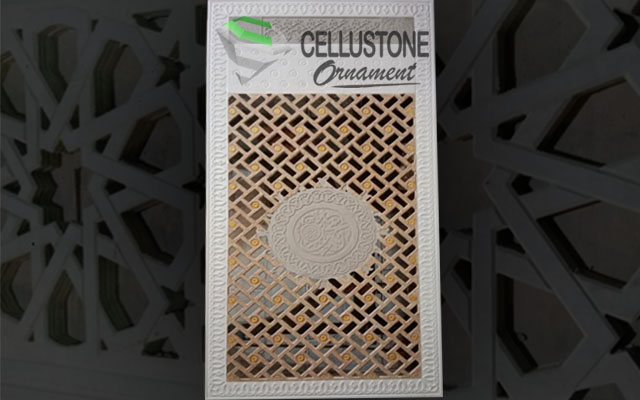 Cellustone mempunyai permukaan halus yang bisa difinishing ulang dengan dicat, baik semprot ataupun dengan kanvas manual. Varian ketebalan material dapat menggunakan 8mm dan 20mm. Karakter Cellustone bendung air, bendung api, tak mudah lapuk dan dimakan rayap, serta memiliki kekuatan tahan yang bagus terhadap perubahan temperatur dan cuaca. Karakter inilah yang mewujudkan Cellustone benar-benar layak untuk dekorasi dan ornamen masjid. Selain itu, Cellustone juga bisa digunakan untuk aplikasi fasad, wallpanel, letter, ceiling, krawangan, kubah masjid, kaligrafi masjid / mushola, partisi dan lain lain sesuai permintaan dan bentuk seperti ornamen masjid nabawi, ,ornamen masjid madinah, ornamen masjid modern .